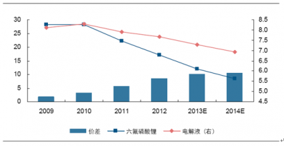 2009-2014年電解液和六氟磷酸鋰價差預測