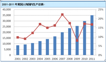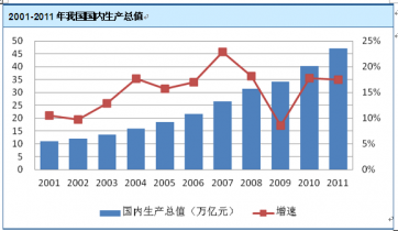 我國國內(nèi)生產(chǎn)總值在近年來一直保持了較快發(fā)展速度。2001 年至2011 年,復(fù)合增長率為15.70%,至2011 年達(dá)到47.16 萬億元,成為世界第二大經(jīng)濟(jì)體。