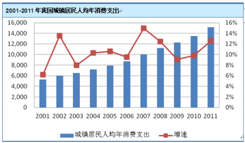 2001 年至2011 年,與我國國內(nèi)生產(chǎn)總值、人均國內(nèi)生產(chǎn)總值、城鎮(zhèn)人均可支配收入持續(xù)穩(wěn)定增長相一致,我國城鎮(zhèn)居民人均年消費(fèi)支出也呈現(xiàn)出穩(wěn)定增長的態(tài)勢,年均復(fù)合增長率為11.06%,至2011 年達(dá)到1.52 萬元。