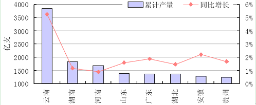 從各省市的產(chǎn)量來看,云南省是我國卷煙大省,2012年1~12月,云南省卷煙的產(chǎn)量達3841.16億支,同比增長5.24%,占全國總產(chǎn)量的15.27%。緊隨其后的是湖南省、河南省和山東省,分別占總產(chǎn)量的7.30%、6.72%和5.50%。