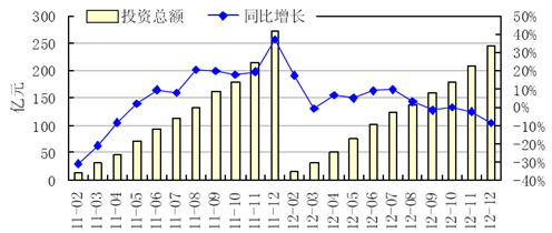 2012年以來,盡管煙草行業(yè)繼續(xù)推進煙葉生產(chǎn)基礎(chǔ)設(shè)施建設(shè),但受經(jīng)濟增速放緩的不利影響,行業(yè)固定資產(chǎn)投資增速下滑。1~12月,我國煙草制造業(yè)實現(xiàn)固定資產(chǎn)投資245.17億元,同比下降8.72%,增速較前3季度下降6.99個百分點,較上年同期下降40.42個百分點。其中,4季度煙草制造業(yè)實現(xiàn)固定資產(chǎn)投資85.85億元,較3季度增加27.76億元。