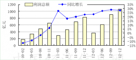 2012年4季度,盡管煙草制品行業(yè)面臨一定的成本壓力,但供銷旺盛的局面推高行業(yè)盈利水平,利潤總額保持增長。1~12月,行業(yè)實現(xiàn)利潤總額1058.49億元,同比增長27.64%,增速較前3季度下降0.93個百分點,較上年同期提高4.98個百分點;其中4季度實現(xiàn)利潤159.17億元,較3季度減少133.16億元。