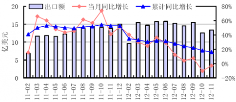 2011年2月~2012年11月工程機械行業(yè)月度出口總額及同比增速