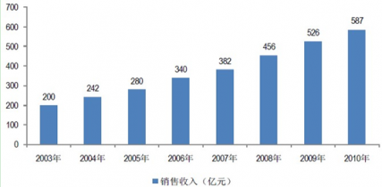 2003 -2010 年我國膠粘劑銷售收入 億元