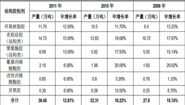 2009 年至2011 年國內結構膠粘劑主要產品產量情況如下表所示: