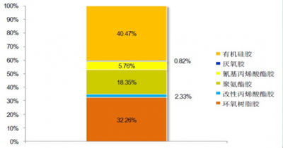 結構膠粘劑產品中產量較大的主要是環氧樹脂膠、有機硅膠和聚氨酯膠,2011 年其產量分別為11.76 萬噸、14.75 萬噸、6.69 萬噸,分別占結構膠粘劑市場的32.26%、40.47%、18.35%。