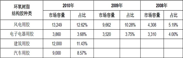 環氧樹脂膠、高性能有機硅膠和聚氨酯膠作為化工新材料,在傳統行業繼續應用發展的基礎上,還在眾多新興領域得到應用,未來將繼續保持高速發展的態勢,增長幅度將可能超過20%。2008年至2010年, 環氧樹脂結構膠市場容量增長幅度最大的應用領域主要為風電、電子電器、建筑等行業。2008年至2010年環氧樹脂結構膠粘劑主要應用行業市場容量如下表所示: