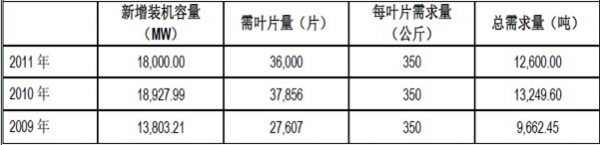 2009年至2011年國內風電用環氧樹脂結構膠市場需求量如下表所示: