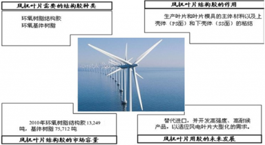 我國風電行業的迅猛發展也帶動了風電設備產業鏈的快速發展。風機葉片是風力發電機組的關鍵部件。風電葉片主要由玻璃纖維布、環氧樹脂結構膠、環氧基體樹脂、夾心材料和葉片涂層等材料組成。其中,環氧樹脂結構膠主要是用于風電葉片上殼體和下殼體的粘接;環氧基體樹脂是生產葉片和葉片模具的主體材料。按照我國國內風電裝機容量到2020年達到2.3億KW預測,以1.5MW主機每套需3片葉片,每片葉片環氧結構膠和環氧基體樹脂的用量分別為0.35噸和2噸計算,2011年到2020年我國風電葉片用環氧樹脂結構膠和環氧基體樹脂每年的平均需求量分別約為12,969噸和74,107噸。