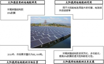 在太陽能領域,膠粘劑主要用于太陽能電池的硅片切割工藝、太陽能電池組件的組裝和密封。近幾年,我國太陽能電池產業迅猛發展,全球太陽能光伏產業聯盟(SEMI)資料顯示,2009年中國太陽能電池產量超過4,000MW,生產規模居全球第一。太陽能電池用結構膠粘劑主要是環氧樹脂結構膠、EVA膠膜等,其中以EVA膠膜為主。按照每生產一個兆瓦的光伏組件需要使用約7噸左右的結構膠粘劑計算,2010年需求量達到56,000噸,按20%的保守行業增長率,2012年我國太陽能電池生產用結構膠粘劑年需求量達80,000噸左右。我國作為全球最大的太陽能電池生產國,太陽能電池的產量不斷增長,對膠粘劑的市場需求量將會不斷增加。