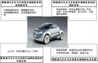 此外,發展新能源汽車還會推進汽車輕量化進程。采用鋁、鎂、陶瓷、塑料、玻璃纖維或碳纖維復合材料等輕質材料是實現汽車輕量化的最主要途徑,而陶瓷、塑料、玻璃纖維或碳纖維復合材料無法采用焊接、鉚接等傳統的連接工藝,需要用結構膠粘劑進行粘接。據中國汽車工業協會統計,2010年我國汽車產量為1,800萬輛,汽車膠粘劑用量約為15.7萬噸,其中結構膠膠粘劑用量約為11.1萬噸。隨著汽車輕量化技術的發展,汽車用結構膠粘劑的需求量將會明顯增加。