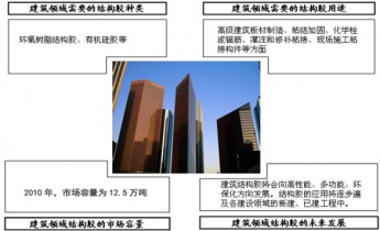 (5)建筑應用領域 結構膠粘劑在建筑領域的應用主要集中在高級建筑板材制造、粘接加固、化學栓或錨筋、灌注和修補粘接、現場施工粘接構件等方面。2010年,我國建筑領域用結構膠需求量為12.5萬噸。我國建筑行業的高速發展給建筑結構膠提供了極好的持續發展機遇。我國已建建筑有相當部分需要加固、維修和改造,同時,在新的建筑設計中結構膠的使用逐漸增加,為建筑結構膠市場提供了廣闊的發展空間。
