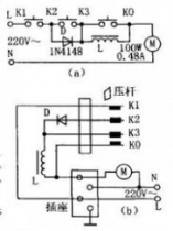 微電機(jī)腳踏調(diào)速器常用于小型繞線機(jī)、縫紉機(jī)、拷邊機(jī)等,作為有級調(diào)速器使用。其調(diào)速的電機(jī)一般為功率100W,0.48A電流的單相串激式微電機(jī),這類腳踏調(diào)速器的電原理圖如下圖a所示。接線示意圖如下圖b所示。其工作原理為:當(dāng)腳踏下壓桿使K1、K2接通時,220V市電經(jīng)二極管D和電抗器L串聯(lián)后接微電機(jī)M,由于二極管的單向?qū)щ娮饔茫㈦姍C(jī)所得電壓為半波平均值(L直流壓降為幾伏),為95V左右,微電機(jī)處于低速運(yùn)轉(zhuǎn)狀態(tài):當(dāng)腳踏壓桿使K1、K2、K3同時接通時,D被K2、K3短接,220V市電經(jīng)L降壓后加在微電機(jī)上,微電機(jī)處于中速運(yùn)轉(zhuǎn)狀態(tài);當(dāng)腳踏壓桿使K1、K2、K3、K0都接通時,220V市電直接加在微電機(jī)上,這時,微電機(jī)全速運(yùn)轉(zhuǎn),這時力矩最大。平時,微電機(jī)啟動較頻繁,腳踏調(diào)速器承受電流較大,常使調(diào)速器觸點(diǎn)燒熔、粘連和損壞。并引起微電機(jī)電刷、電樞等損壞,給使用者帶來諸多不便。