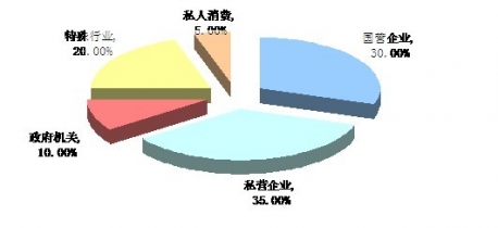 從調(diào)查結(jié)果看,在消費數(shù)量上,目前中等城市和私營業(yè)主及集體企業(yè)己構(gòu)成了皮卡車用戶的主體,再者為特殊行業(yè),如電信維修、油田作業(yè)、地質(zhì)勘探、警察巡邏、市容管理及軍警等集團采購。皮卡進入私人純消費領(lǐng)域微乎其微,僅東部沿海經(jīng)濟發(fā)達地區(qū)的大中城市城鄉(xiāng)結(jié)合和三、四線城市的私人消費者居多。據(jù)最近相關(guān)資料顯示:皮卡車銷向國營企業(yè)為30%左右、私營企業(yè)為35%上下、政府機關(guān)的為10%前后、特殊行業(yè)的為20%,而私人消費在5%左右。