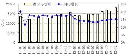 2012年4季度,批發(fā)零售業(yè)保持穩(wěn)步增長態(tài)勢。10~12月,商品零售額同比增速分別為14.6%、15.0%、15.2%,逐月上升。1~12月,我國實(shí)現(xiàn)商品零售額18.39萬億元,同比增長14.4%,增速略高于全社會(huì)消費(fèi)品零售總額14.3%的平均增長水平,較上年同期下降2.8個(gè)百分點(diǎn)。
