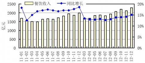 2012年以來,住宿餐飲業(yè)發(fā)展有所趨緩,單店利潤、客房出租率等主要指標(biāo)均較上年有所降低。1~12月,餐飲業(yè)實(shí)現(xiàn)收入23282.7億元,同比增長13.6%,盡管增速較前三季度微升0.4個(gè)百分點(diǎn),但較上年同期下降3.3個(gè)百分點(diǎn),且低于全社會(huì)消費(fèi)品零售總額增速0.7個(gè)百分點(diǎn)。