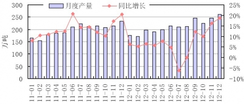 2011-2012年中國乳制品月度產量增長情況分析