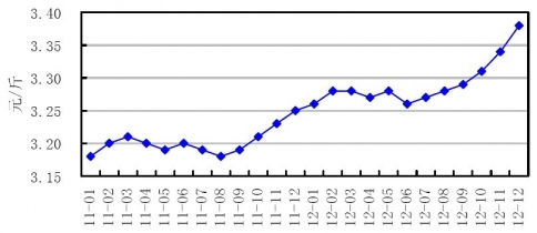 2012年4季度,在玉米價格繼續高位徘徊的背景下,我國奶品質量進一步提升,消費信心不斷恢復,乳制品需求較快增長,推動國內奶價出現較快上漲。12月我國生鮮乳平均價格達到3.38元/公斤,同比上漲4%。