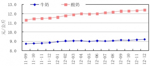 2012年4季度,受上游原料價格和人工成本上漲影響,我國乳制品零售產品價格保持震蕩上揚走勢。其中,牛奶零售價格從3季度的9.13元/公斤水平上漲至9.2元/公斤,漲幅達到0.77%;酸奶價格由3季度的12.27元/公斤上漲至12.4元/公斤,漲幅達到1.1%。其他乳制品如國產奶粉、進口奶粉以及成人奶粉的零售價格也出現不同程度的上漲。