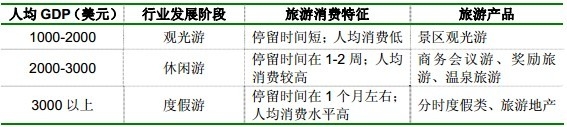 根據(jù)旅游消費(fèi)自身發(fā)展的規(guī)律:旅游消費(fèi)將經(jīng)歷一個(gè)消費(fèi)升級的過程,先后經(jīng)歷觀光游—休閑游—度假游三個(gè)階段,旅游業(yè)的發(fā)展階段與消費(fèi)特征如下: