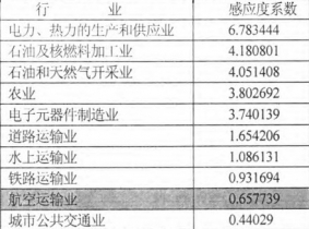 感應(yīng)度系數(shù)是反映當(dāng)國(guó)比經(jīng)濟(jì)各部門(mén)均增加一個(gè)單位最終使州時(shí),某一部門(mén)由此而受到的供給感應(yīng)程度,也就是需要該部門(mén)為其他部門(mén)的生產(chǎn)而提供的產(chǎn)山莓。一個(gè)部門(mén)的感應(yīng)度系數(shù)反映出該部門(mén)發(fā)展受其他部門(mén)發(fā)展的影響程度。當(dāng)某部門(mén)感應(yīng)度系數(shù)大于l時(shí),表示該部門(mén)所受到的供給感應(yīng)程度高于社會(huì)平均水平:當(dāng)某部門(mén)感應(yīng)度系數(shù)等于1時(shí),表示該部門(mén)所受到的感應(yīng)程度等于社會(huì)平均水平;當(dāng)某部門(mén)感應(yīng)度系數(shù)小于1時(shí),表示該部門(mén)所受到的感應(yīng)程度低于社會(huì)平均水平。這個(gè)參數(shù)也可用來(lái)分析當(dāng)國(guó)民經(jīng)濟(jì)保持一定的增長(zhǎng)速度時(shí),航空運(yùn)輸部門(mén)應(yīng)該保持什么樣的速度發(fā)展。利用2007年投入產(chǎn)出表,由公式(6)計(jì)算可知,部分產(chǎn)業(yè)部門(mén)的感應(yīng)度系數(shù)見(jiàn)表3。