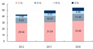 未來(lái)火電將長(zhǎng)期占據(jù)全球電力裝機(jī)的主導(dǎo)地位。2012 年,火電裝機(jī)占全球電力裝機(jī)總量的比例為69%。2015 年和2020 年,盡管全球火電占比有所下降,但仍然分別保持63%和61%的較高水平。